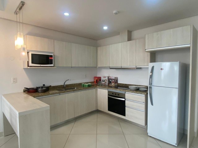 • Cocina integrada, amoblada y equipada con Heladera, Horno, Anafe con Extractor, Microondas, Licuadora, Sanwichera.